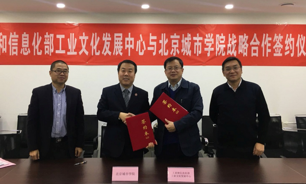 2017年12月12日,北京城市學院與工業和信息化部(以下簡稱“工信部”)工業文化發展中心戰略合作協議簽約儀式順利舉行。工信部工業文化發展中心主任羅民、主任助理馬翔,我校黨委書記、校長劉林,文化學院副院長、工藝美術系主任陳秋榮出席簽約儀式。此次戰略合作簽約儀式上,我校與工信部工業文化發展中心建立了新型戰略合作關系。