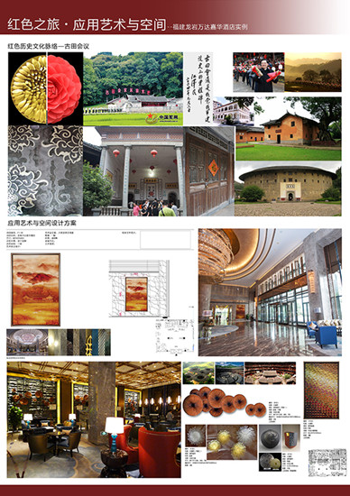 應用藝術與空間實例《紅色之旅》則以福建龍巖萬達嘉華酒店為例,紅色之旅的元素被完美應用到現代藝術中,凸顯了工藝美術系應用藝術與空間專業的特色。