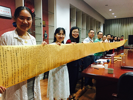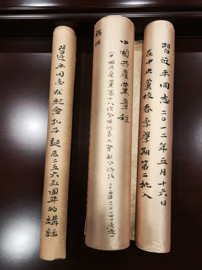 書法作品《中國共產黨黨章》、《堅持實事求是的思想路線》(習近平總書記在中央黨校開學典禮上的講話)、《在紀念孔子誕辰2565周年國際學術研討會暨國際儒學聯合會第五屆會員大會開幕會上的講話》,皆是用小楷手抄全文,總字數達幾萬余,凝聚著工藝美術系教師認真學習黨章黨規、學習習近平總書記系列重要講話的心血,讀來感人肺腑、催人奮進。