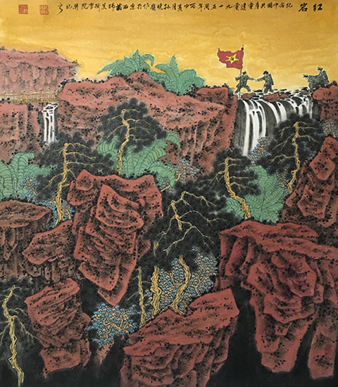 紙本重彩國畫作品《紅巖》,險峻的紅色巖石間穿插著挺拔的松樹、芭蕉葉,表現出中國共產黨的堅韌不拔、四季常青;幾位解放軍戰士手握黨旗、相互攙扶、不畏艱辛,體現的正是小說《紅巖》中所描述的中國共產黨人的“紅巖精神”。
