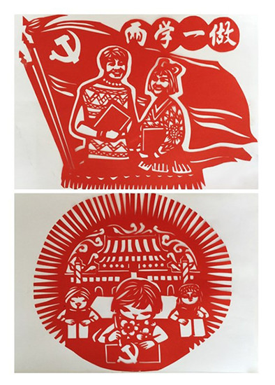 剪紙作品《再憶“學而”知行合一》,取“學而時習之”與“知行合一”之意,表達“兩學一做”基礎在學、關鍵在做;作品運用了象征著富貴、吉祥的中國傳統紋飾牡丹、蝙蝠,象征著和平、友誼的橄欖枝、和平鴿,寓意美好的圖案圍繞著一枚光芒普照四方的黨徽,向黨的95周年誕辰獻禮。剪紙作品《理想信念》,表現了當代青年堅定共產主義理想信念,提高黨性覺悟,努力開展“兩學一做”學習教育的場景。