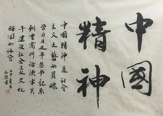 書法作品《中國精神》,選材自習近平總書記在文藝工作座談會上的重要講話,“中國精神是社會主義文藝的靈魂”這一重要論斷,將指引著文藝工作者前進的方向。
