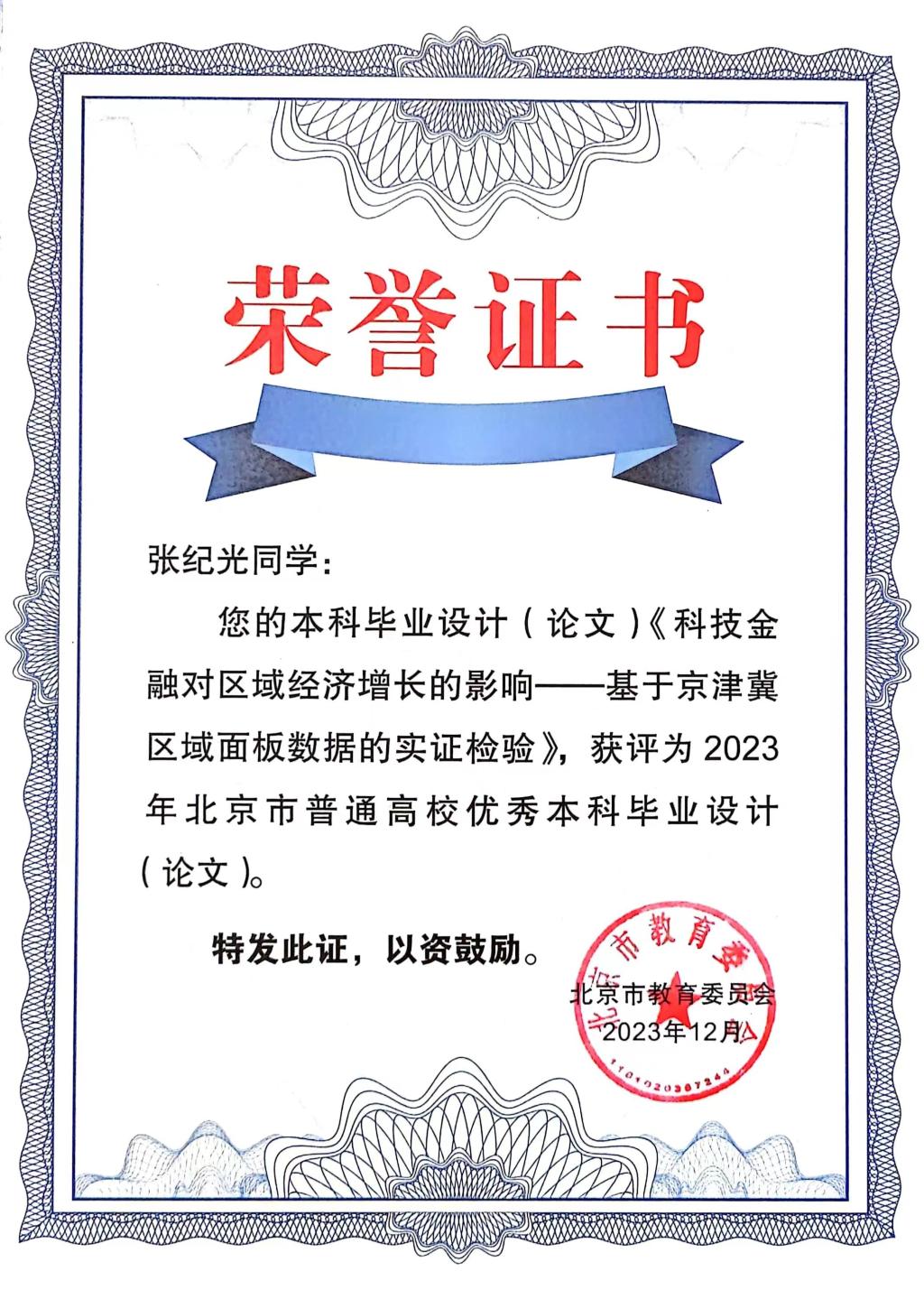 2016年、2017年、2020年多名學(xué)生分別成功獲得“北京高等學(xué)校高水平人才交叉培養(yǎng)畢業(yè)設(shè)計(jì)支持計(jì)劃項(xiàng)目 “創(chuàng)業(yè)類”“科研類”“深化類”的資助立項(xiàng),體現(xiàn)了本專業(yè)指導(dǎo)教師與學(xué)生較強(qiáng)的專業(yè)能力與綜合素養(yǎng)。在畢業(yè)論文方面,近年相繼有10多名學(xué)生的畢業(yè)論文經(jīng)校內(nèi)外專家的評(píng)審,被評(píng)為北京市級(jí)優(yōu)秀本科論文,如20屆崔鑫的《交通銀行網(wǎng)點(diǎn)業(yè)務(wù)轉(zhuǎn)型現(xiàn)狀調(diào)查與分析——以北京朝陽區(qū)林萃路支行為例》、21屆祁譜旭的《中國(guó)券商體系脆弱性的實(shí)證研究——基于2010—2019年的相關(guān)數(shù)據(jù)》、22屆胡爽的《金融素養(yǎng)對(duì)家庭金融資產(chǎn)配置的影響研究——基于CHFS數(shù)據(jù)的實(shí)證分析》、23屆張紀(jì)光的《科技金融對(duì)區(qū)域經(jīng)濟(jì)增長(zhǎng)的影響——基于京津冀區(qū)域面板數(shù)據(jù)的實(shí)證檢驗(yàn)》等。此外,多名同學(xué)在校期間還發(fā)表了學(xué)術(shù)論文。