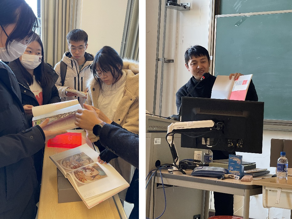 講座伊始,田老師對“7x3”主題進行了闡釋:“‘7x3’,‘7’是7本書,‘3’則是書籍裝幀設計的三個維度——‘概念編輯設計’、‘編排設計’與‘裝幀設計’。” 他認為書籍設計是一個整體,在設計中應該做到書籍內容與設計的統一。同時,田老師為同學們帶來了實物的7本書,方便師生們現場觸摸與感受紙張與印刷的魅力。