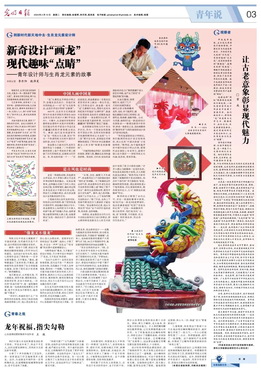 《光明日報》的記者在北京的北海公園參觀 “2024 全球集慶生肖設計大賽作品展”時,被袁金鼎老師的作品所吸引,并決定對他進行采訪。在采訪中,袁金鼎老師分享了他的設計理念和創作過程,讓更多人了解到了他的藝術才華和對設計的熱愛。