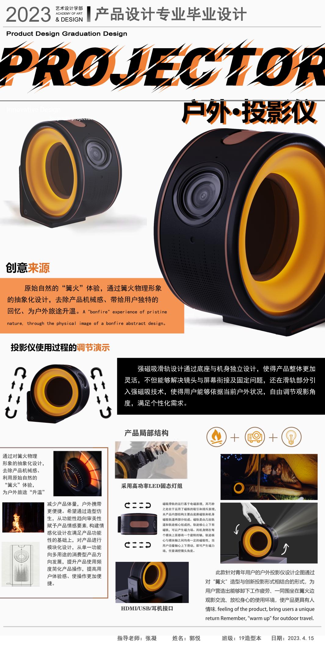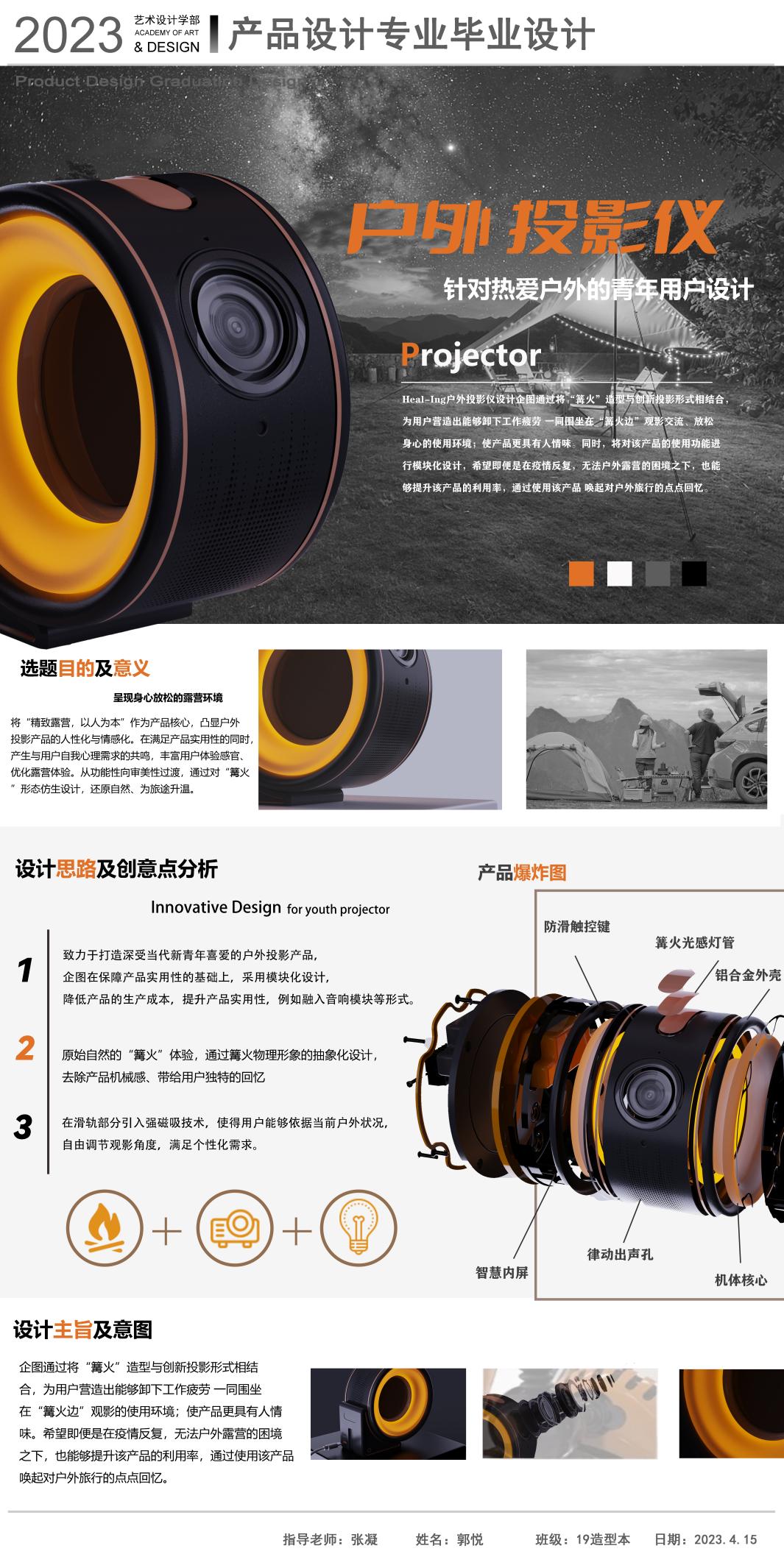 在童年時期的孩子總是想象力非常豐富的,時常會幻想在黑夜中的某個角落,躲藏著一些不為人知的幽靈或者怪獸。但是長大以后的成Heal-Ing戶外投影儀設計企圖通過將“篝火”造型與創新投影儀形式相結合,為用戶營造出能夠卸下工作疲勞一同圍坐在“篝火邊”觀影交流、放松身心的使用環境;使產品更具有人情味。同時,將對該產品的使用功能進行模塊化設計,希望即便是在疫情反復,無法戶外露營的困境之下,也能夠提升該產品的利用率,通過使用該產品喚起對戶外旅行的點點回忙。