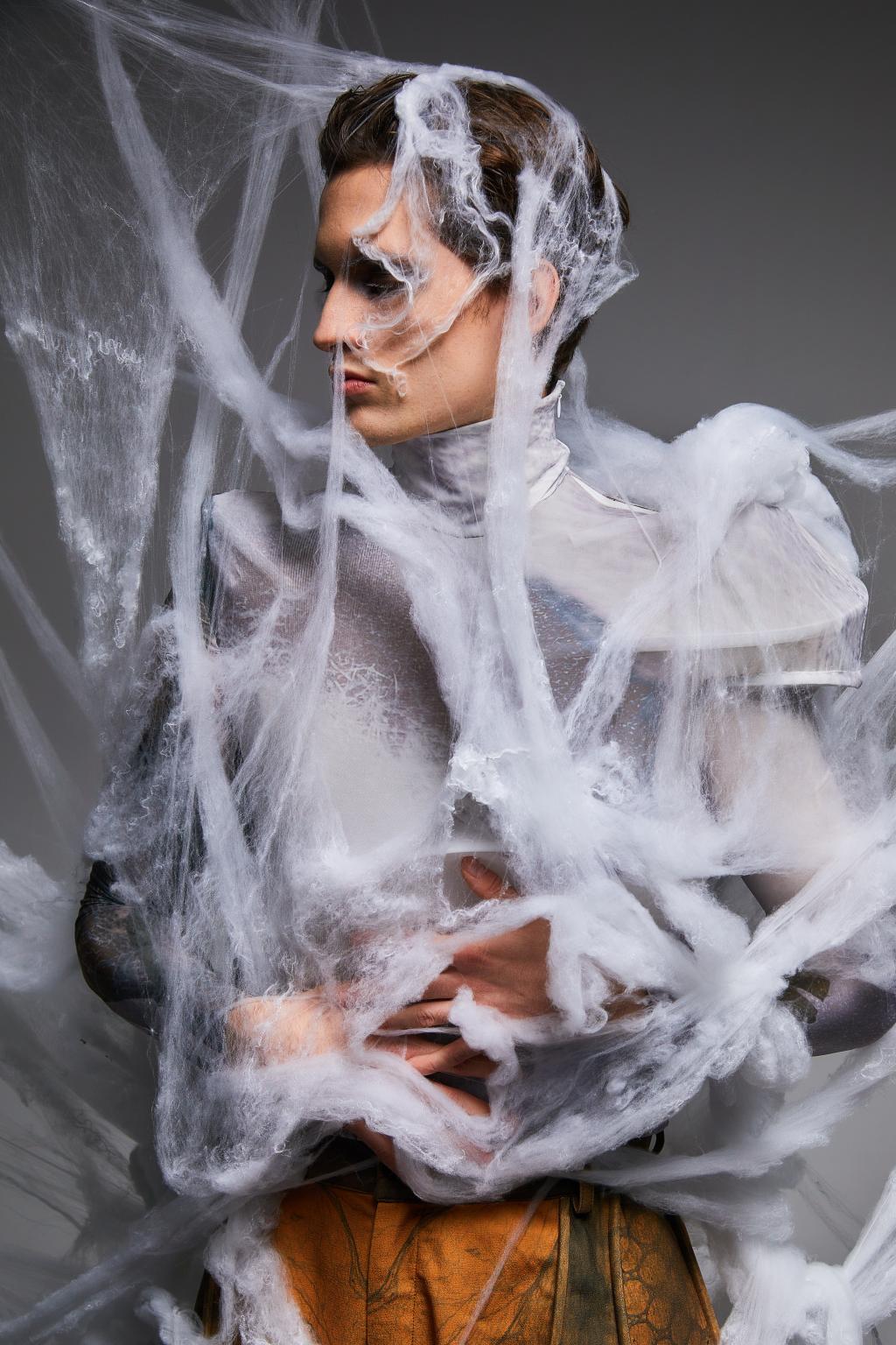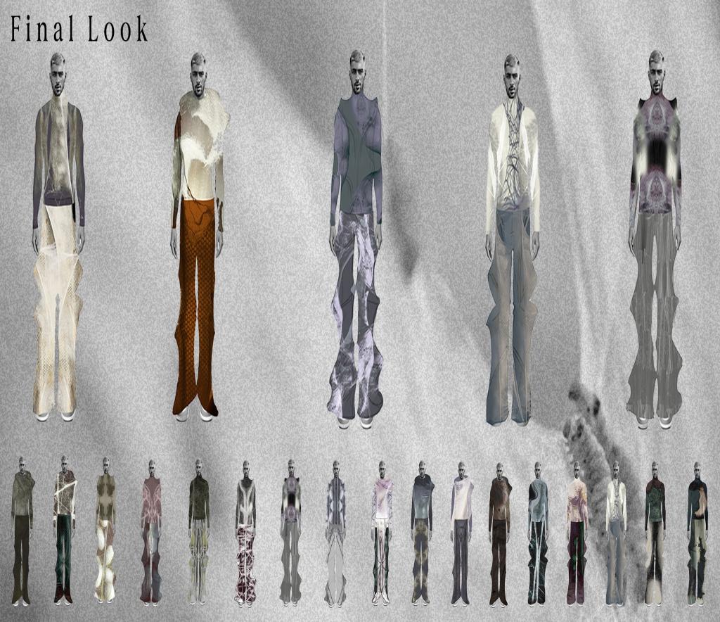蠶和石蠶,這兩種昆蟲具有不同筑巢方式,通過這兩種不同的生物給我?guī)砹岁P(guān)于服裝輪廓和印花的靈感。在服裝設(shè)計中,我通過這兩點靈感對服裝進行設(shè)計,大膽將生物建筑與服裝設(shè)計結(jié)合。
