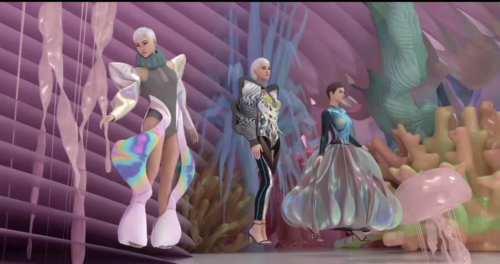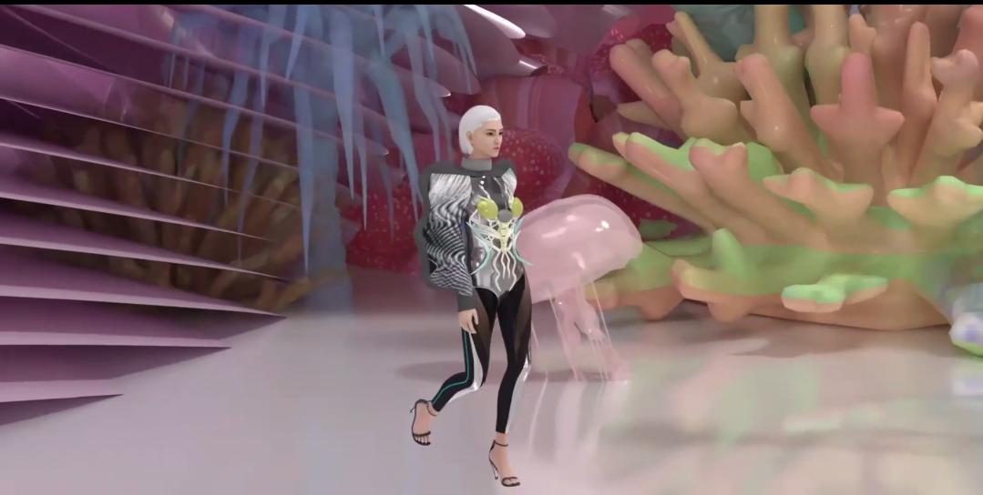 我運用仿生水母與金屬異形的廓形結(jié)合來體現(xiàn)未來世界的美輪美奐。三款設(shè)計分別運用3D打印技術(shù)、數(shù)碼印花與熱成像技術(shù),整體服裝呈現(xiàn)出一種五彩斑斕的效果,既強調(diào)在風格上發(fā)揚個性,又盡力探索未來主義風格的服裝形式。