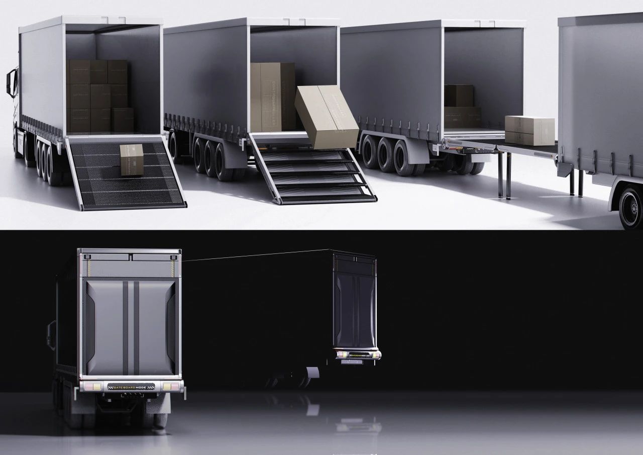 設計說明:本產品將貨車門板,傳送帶,樓梯,貨物中轉平臺的功能一體式整合,提供了一種更加智能化、安全化和高效化的物流裝卸解決方案,不僅提升了貨物裝卸以及物流中轉效率,也為用戶創造了更便捷和安全的使用體驗,適用于物流運輸過程中的多種場景。