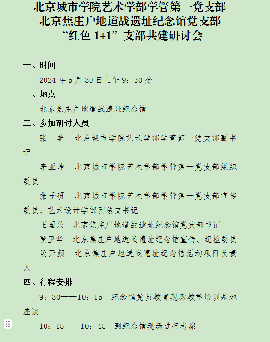 5月30日,藝術學部學管第一黨支部前往北京市順義區焦莊戶地道戰遺址紀念館進行紅色1+1支部共建活動。本次兩個支部書記共同見面展開研討,達成了今后支部互相往來、學生為紀念館對外宣講提供志愿服務支持、參加館內講解培訓以及墻體彩繪等達成合作意向。