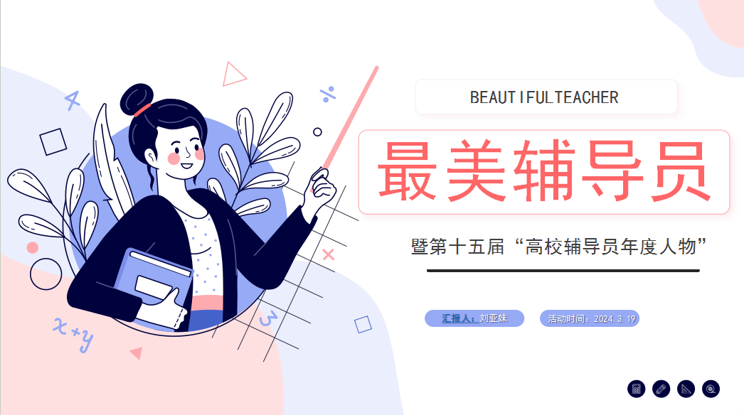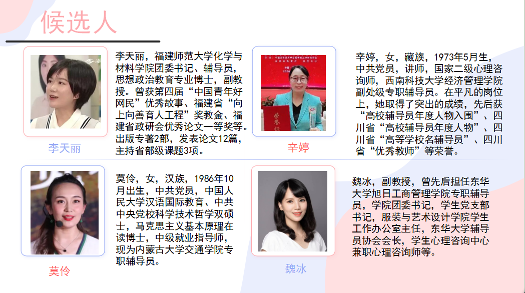 四是擔任東華大學旭日工商管理學院專職輔導員魏冰老師。她堅持以學生為中心,做發揮網絡育人優勢的名師專家,與時代同行,創建“sunshine微課工作室”,潤物無聲塑品味;不同場域構建紅色課堂,成為滬上高校輔導員講黨史的最“紅”先行者,拓展三尺講臺,讓黨史學習教育“活起來”“潮起來”,擲地有聲塑品行;摯愛學生14年,她是學生心中“最懂學生”的好老師和最信任的心靈守護者,將心理元素融入思政教育,化危機,促發展,用愛守護塑品格。