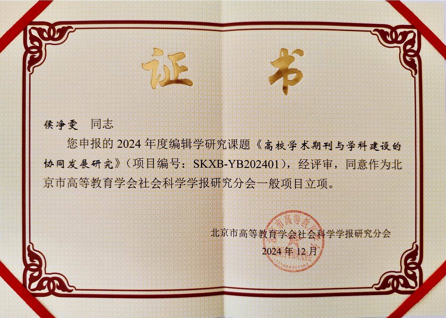 近日,北京市高教學會社會科學學報研究分會正式公布了2024年度編輯學研究課題的立項名單。《北京城市學院學報》編輯侯凈雯老師成功獲批一般項目,這一成就標志著該學報在編輯學研究領域實現了零的突破,首次獲得研究立項。此項目的取得將為學報未來的學術探索與實踐奠定了堅實的基礎。