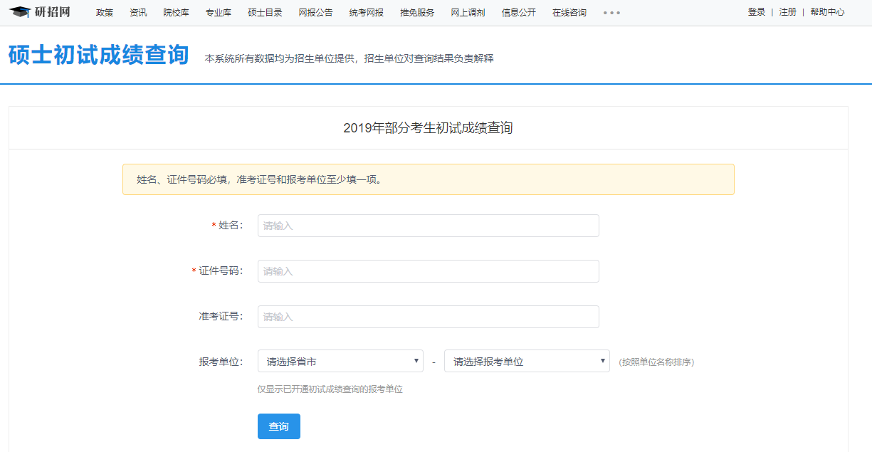 2.查詢方式:登錄中國研究生招生信息網(wǎng)成績查詢頁面(具體網(wǎng)址為http://yz.chsi.com.cn/apply/cjcx/),根據(jù)系統(tǒng)要求輸入相關(guān)信息后查詢成績,所需信息準(zhǔn)考證中均能找到,查詢界面如下圖。