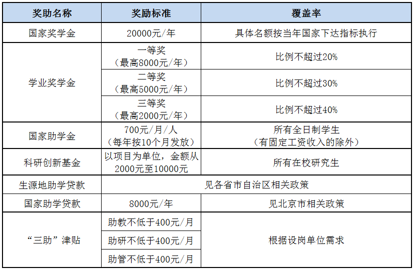 根據北京市財政局、北京市教育委員會制定的《北京市研究生國家獎學金、學業獎學金、國家助學金管理暫行辦法》,我校研究生設置有國家獎學金、學業獎學金和助學金,國家獎學金和學業獎學金按照獎學金評選辦法進行評選,助學金面向非定向學生。同時,學校設置研究生“三助”崗位,為研究生提供勤工助學機會。
