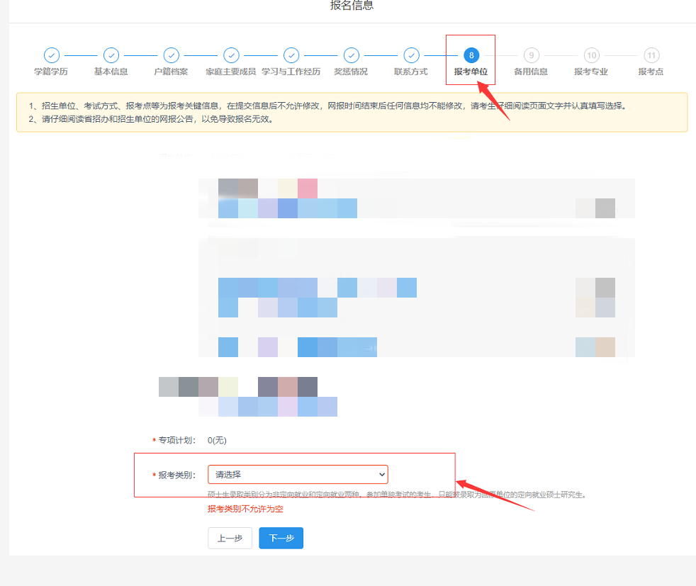 第二步,點擊“修改報名信息”,修改報名信息時,前面頁面內的其他正確的信息不需要做任何修改,直接點擊“下一步”。在第8項“報考單位”頁面,將報考類別從11非定向修改為12定向,并填寫定向就業單位信息,之后的其他步驟仍只需點擊“下一步”,直到確認報名信息后視為重新提交成功。