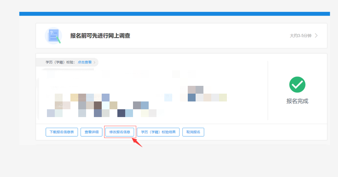 第一步,考生可自行登錄原報名賬號(無需重復注冊),登錄成功后在報名信息下方會看到“修改報名信息”選項。