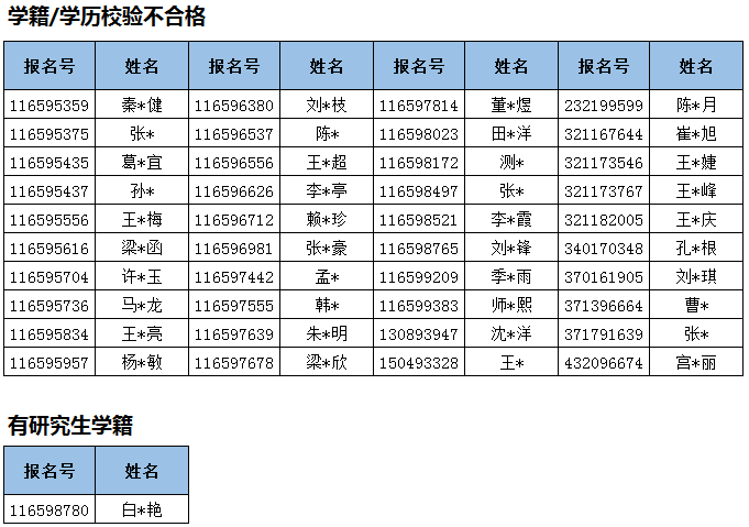 注意:所有報考我校考生均須注意以上信息,由于報考仍在進行中,可能仍有不符合我校報考要求的考生未在名單中列出,請所有報考我校的考生認真閱讀招生簡章、專業目錄、網報公告、網上確認公告等,根據相關要求及時修改報考信息或重新報名。請考生如實填寫學習工作單位、戶口所在地、檔案所在單位等信息。凡不按要求報名、網報信息誤填、錯填或填報虛假信息而造成不能確認、考試或錄取的,后果由考生本人承擔。對弄虛作假者,不論何時,一經查實,報考資格、錄取資格將無效,學籍將按有關規定取消。