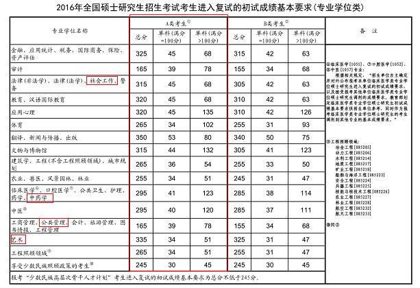 根據教育部公布的《2016年全國碩士研究生招生考試考生進入復試的初試成績基本要求(專業(yè)學位類)》,我校社會工作碩士、中藥學碩士、公共管理碩士及藝術碩士下設的音樂碩士、電影碩士、廣播電視碩士、美術碩士、藝術設計碩士等各領域均按照此要求中A類考生的總分及單科分數要求劃定復試名單(即下圖中紅色框中的分數要求)。具體分數線見下圖: