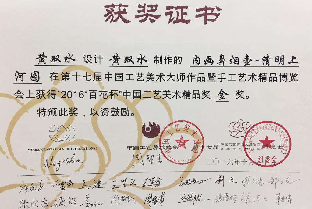 2015年10月,作品《八十七神仙卷》在中國工藝美術協會舉辦的第十六屆中國工藝美術大師作品暨國際藝術精品博覽會中獲得“百花杯”;