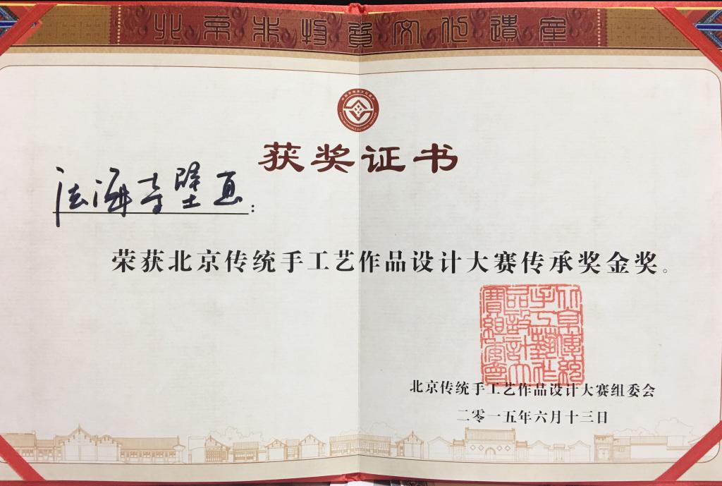 2015年6月,作品《法海寺壁畫》在文化部舉辦的首屆“京津冀傳統手工藝作品設計大獎賽”中獲得金獎;