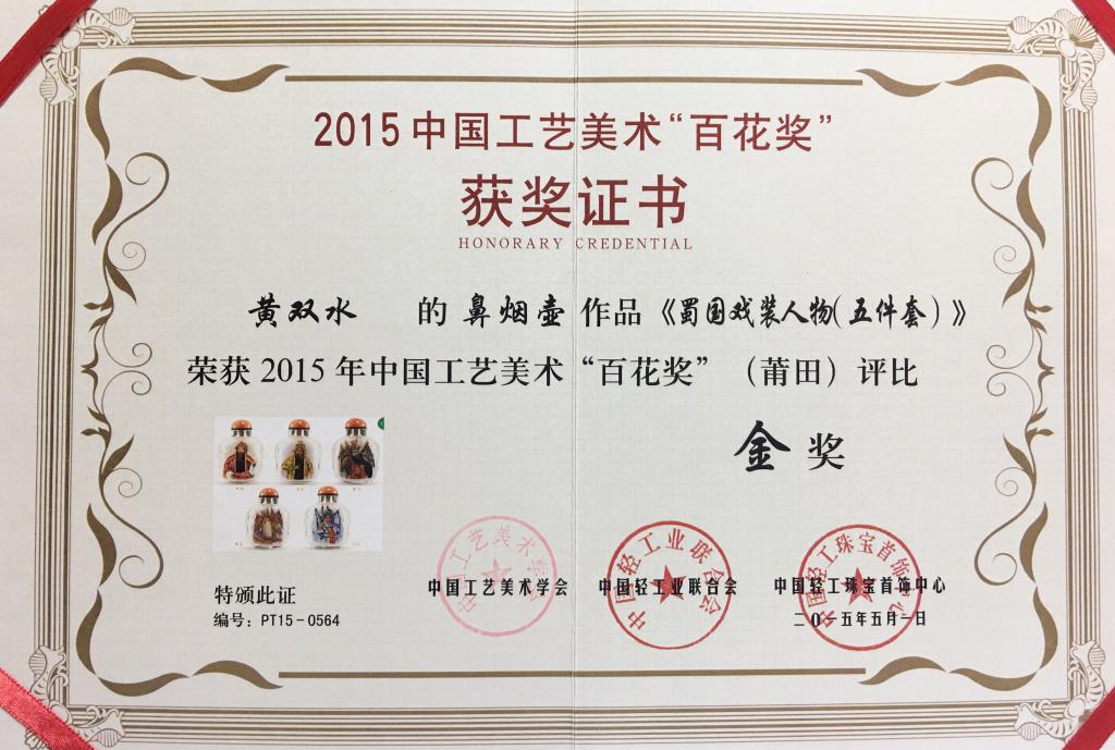 2015年5月,作品《蜀國人物》在中國輕工業聯合會舉辦的中國工藝美術“百花獎”評選中獲得金獎;