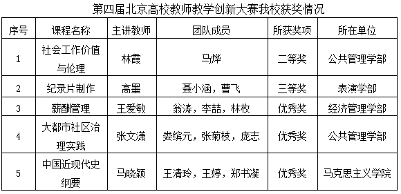 日前,北京市教育委員會公布了第四屆北京高校教師教學創新大賽獲獎名單,我校推薦參賽的5個參賽團隊獲獎。其中,公共管理學部林霞團隊獲二等獎、表演學部高墨團隊獲三等獎,經濟管理學部王愛敏團隊、公共管理學部張文瀟團隊、馬克思主義學院馬曉穎團隊獲優秀獎。