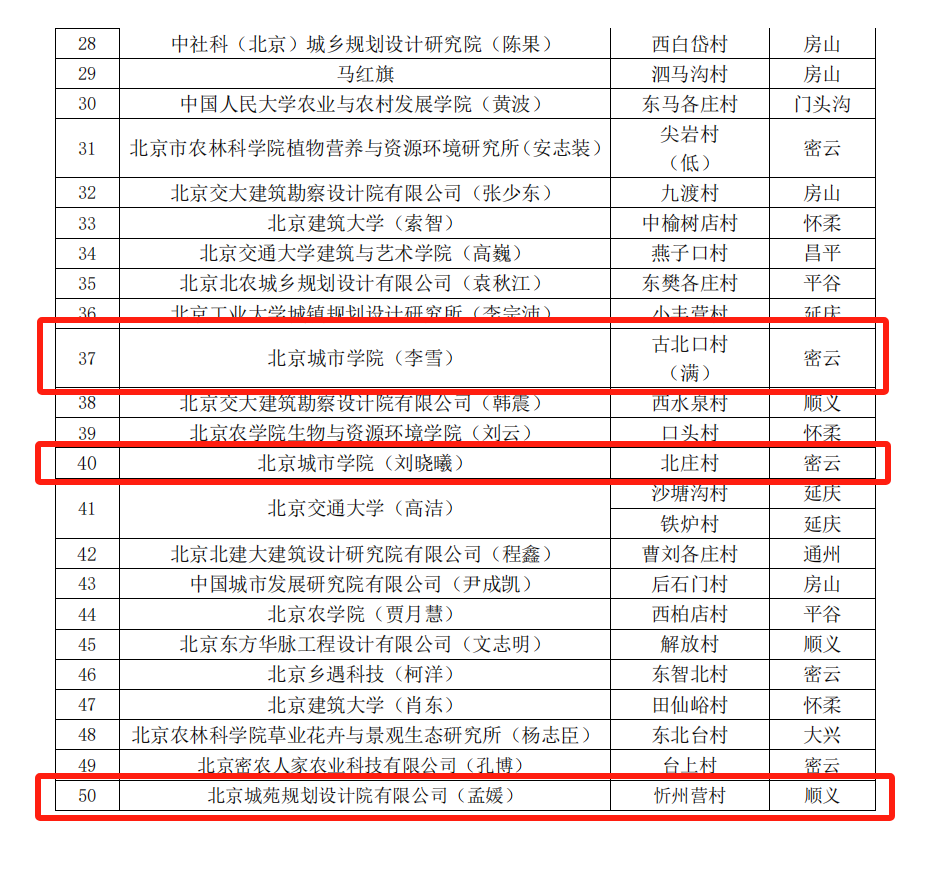近日,北京市農業農村局公布北京市“百師進百村“活動優秀策劃方案、優秀“百師”團隊評審結果。我校城市建設學部孟媛團隊(成員:劉洪潔、蘇瑀)、李雪團隊(成員:李東星、黃艷超、安逸飛)和劉曉曦團隊(成員:劉蕊、孫麗紅、楊易晨、宋欣)被評為優秀“百師”團隊。這3個團隊分別為所服務村莊順義區忻州營村、密云區北莊村、古北口村(滿)提出的特色營造方案獲評優秀策劃方案。