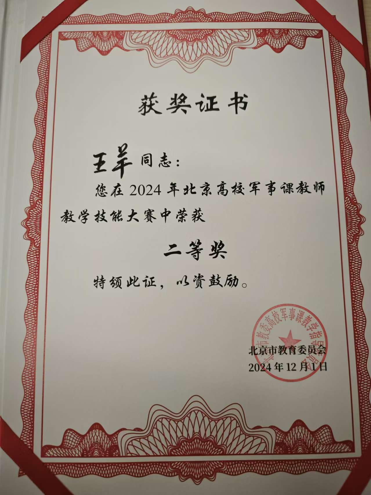 近日,由北京市教育委員會主辦,北京市教委軍事課教學指導委員會承辦的“2024年北京高校軍事課教師教學技能大賽”順利舉辦。在京高校近百名選手經過初賽的激烈角逐,共有15名選手進入總決賽。我校教師王芊憑借出色的教學表現和深厚的專業素養,在眾多參賽選手中脫穎而出,最終榮獲二等獎。
