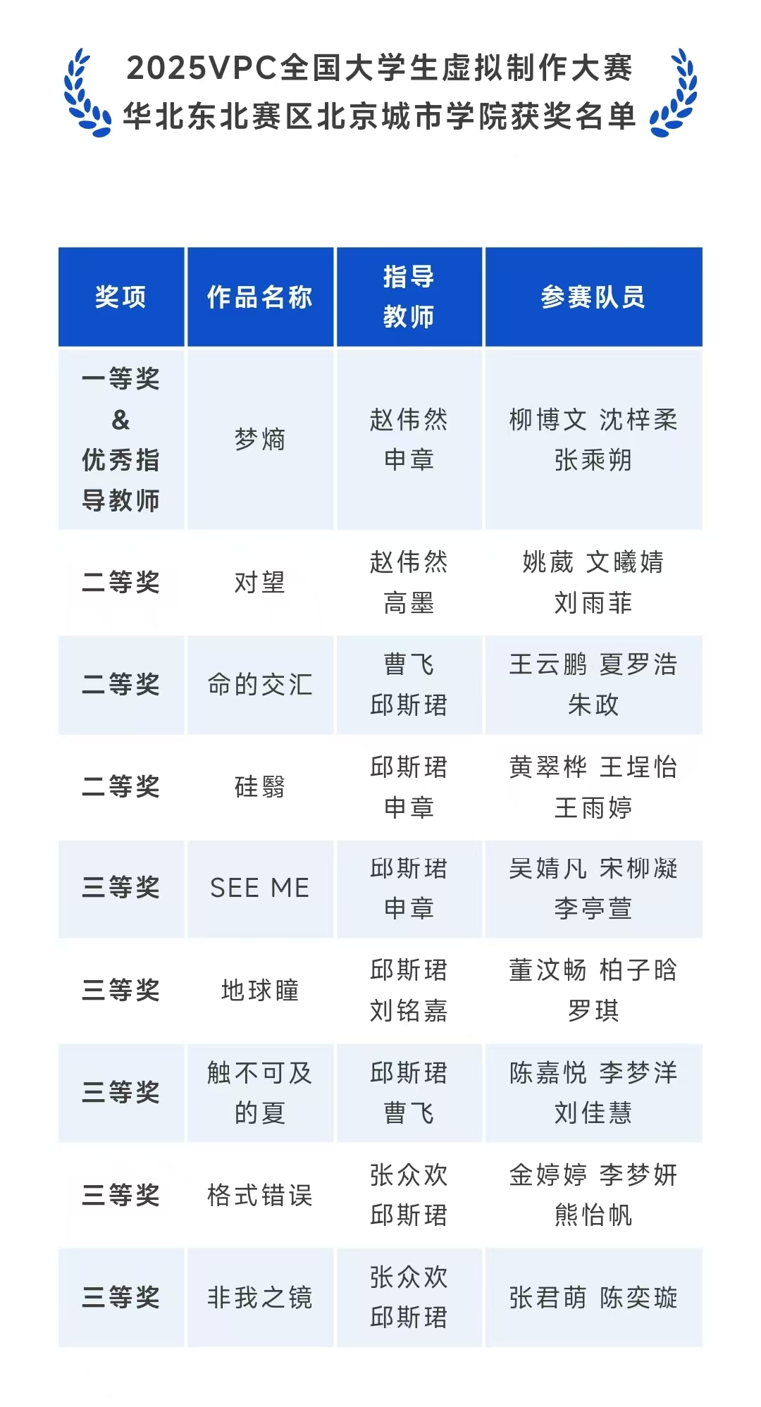 近日,2025VPC全國大學生虛擬制作大賽獲獎名單公布,由我校表演學部教師趙偉然、申章指導,教師李鵬、于點傾情演繹,學生柳博文、沈梓柔、張乘朔制作的科幻短片作品《夢熵》榮獲華北東北賽區一等獎,由曹飛、張眾歡、劉銘嘉、邱斯珺等教師指導的其余6支參賽隊伍分別榮獲二、三等獎。