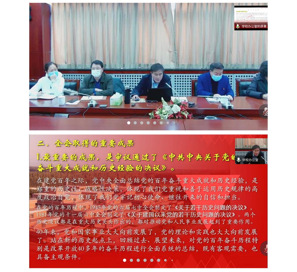 11月15日上午,我校黨委召開理論中心組學習(擴大)會,傳達學習黨的十九屆六中全會精神,安排部署全校學習宣傳貫徹落實工作。黨委書記龔裕同志就學習宣傳貫徹黨的十九屆六中全會作專題報告。會議采取線上線下相結合的方式進行,基層黨組織書記和部門負責人以騰訊會議的形式線上參會。