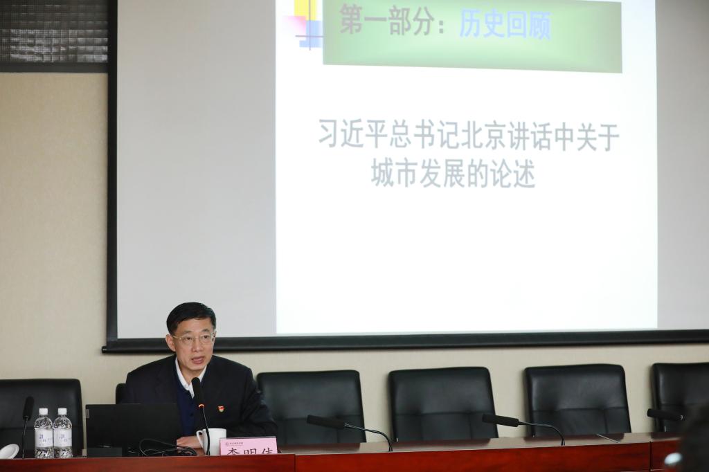 報(bào)告會上,李明偉教授緊緊圍繞習(xí)近平總書記對于北京城市總體規(guī)劃的論述,分析了習(xí)近平總書記兩次視察北京的重要指示,強(qiáng)調(diào)了“建設(shè)一個什么樣的首都,怎樣建設(shè)首都”、疏解北京非首都功能、加強(qiáng)精細(xì)化管理、以釘釘子精神抓好貫徹落實(shí)等問題,并指出北京將進(jìn)一步確立首都城市戰(zhàn)略定位,加強(qiáng)“四個中心”功能建設(shè),提高“四個服務(wù)”水平的未來發(fā)展方向。