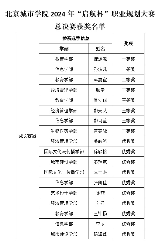 經過現場評審,教育學部龐源源獲成長賽道決賽一等獎,表演學部王睿婷獲就業賽道決賽一等獎。陳怡等76位教師獲得校內職業成長導師暨優秀指導教師獎。教育學部學生工作辦公室等6個部門獲得最佳組織獎。