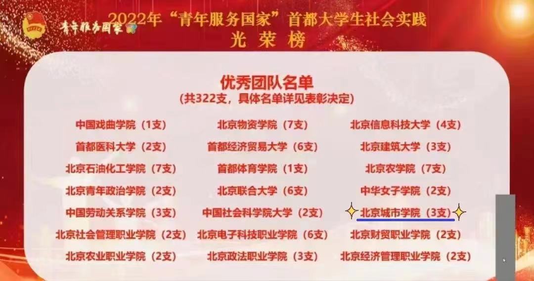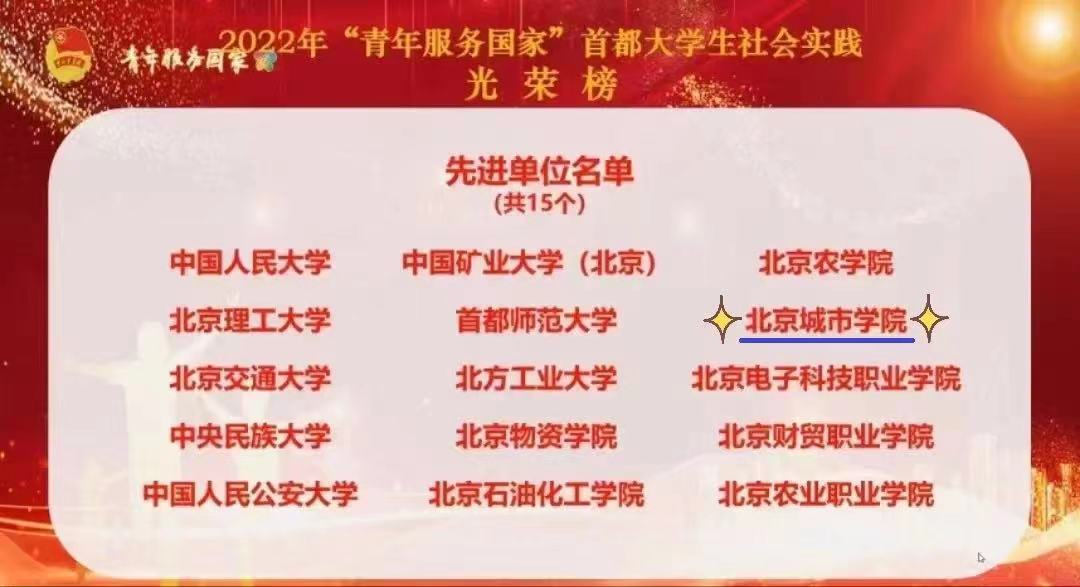 12月29日,我校在共青團北京市委員會、北京市委教育工作委員會、北京市委宣傳部、首都精神文明建設委員會辦公室、北京市教育委員會和北京市學生聯合會聯合評選的“學習二十大 永遠跟黨走 奮進新征程”2022年首都大學生暑期社會實踐活動總結表彰大會中榮獲先進單位稱號。