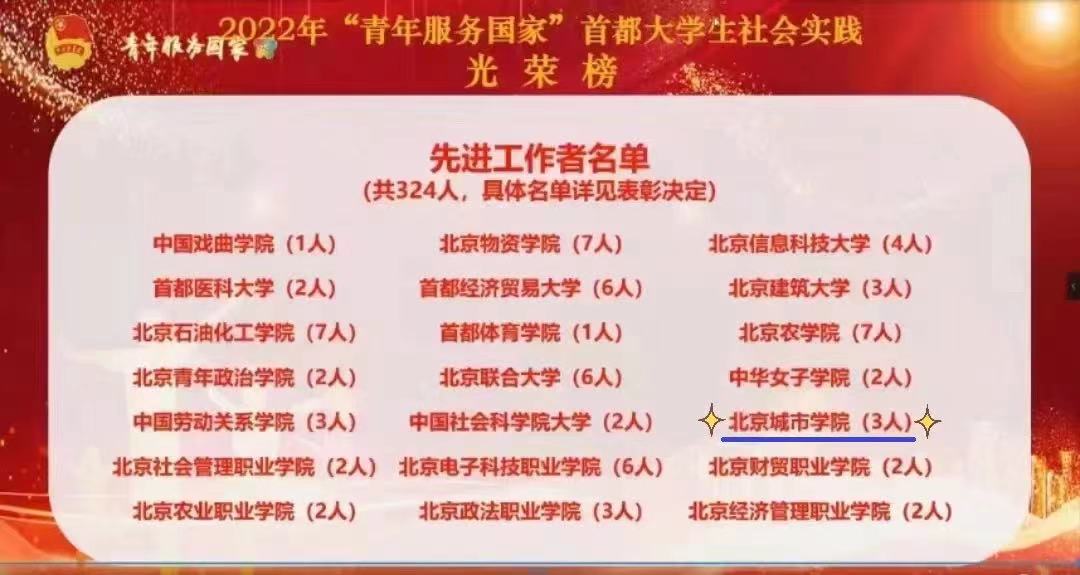 在此次評選中,全市共92所高校,1.1萬支團隊,5000余名指導教師參與,共有15所高校獲2022年“暑期社會實踐先進單位”稱號,324名老師獲20222年“暑期社會實踐先進工作者”稱號,322名學生獲2022年“暑期社會實踐先進個人”稱號,322支團隊獲2022年“首都大學生暑期社會實踐優秀團隊”稱號。