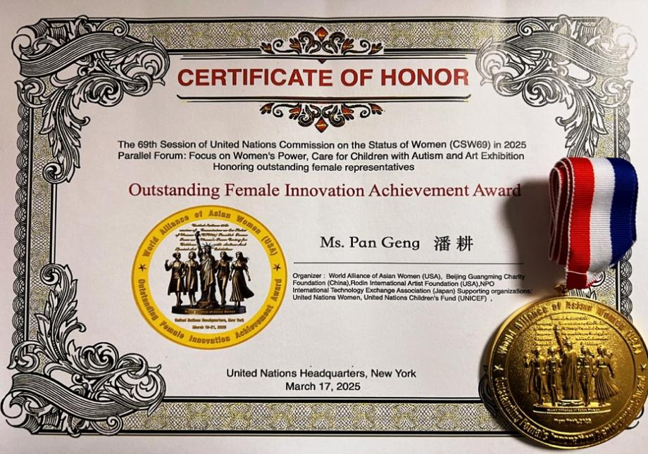 2025年聯合國婦女地位委員會第69屆會議(CSW69)于3月10日至3月21日在聯合國總部舉行。我校表演學部廣播電視編導(影視編創)專業教師潘耕受世界亞裔女性聯盟邀請,于紐約聯合國總部外交會議廳參加會議平行論壇:聚焦女性力量,關愛孤獨癥兒童及“愛與希望”藝術特展,并獲得“杰出女性創新成就獎”。
