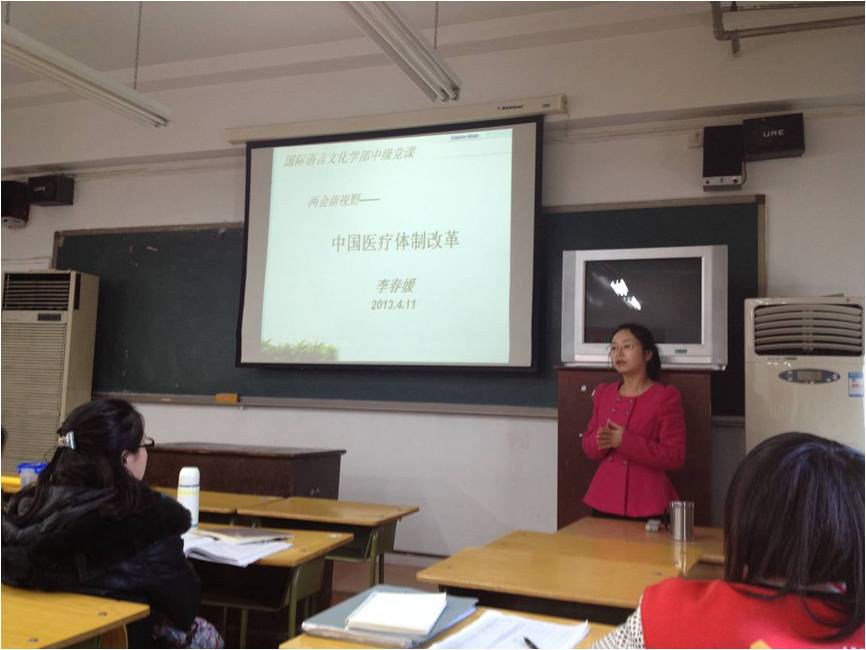 2013年4月11日下午,語言黨支部于教一樓601教室舉行本學期第二次中級黨課學習。本次黨課主題為“兩會新視野——中國醫療體制的改革”,由輔導員李春媛老師主講。