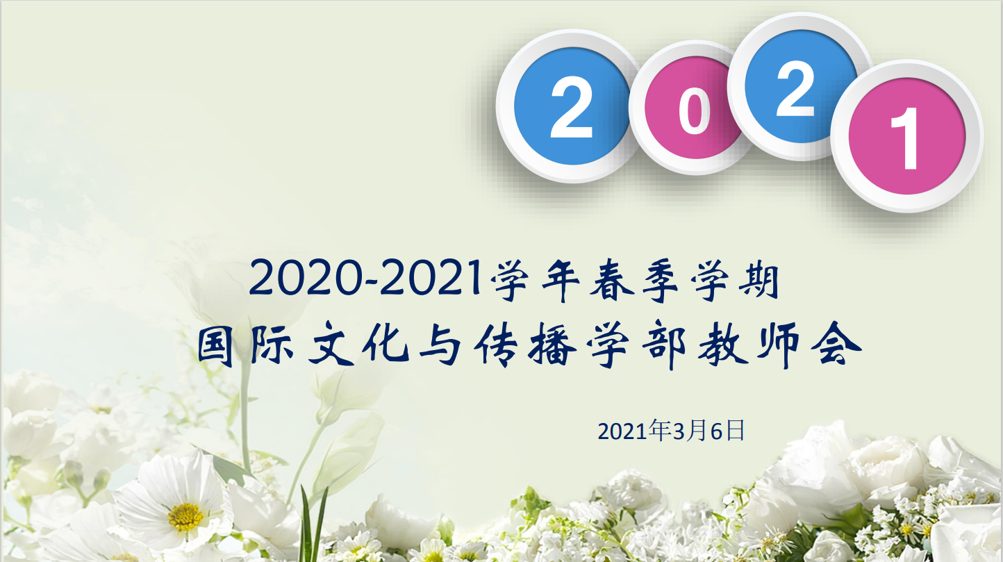 為保障新學期各項教學工作順利開展,國際文化與傳播學部于3月6日通過線上會議方式召開了2020-2021學年春季學期全體教師大會,學部核心組成員、學校督導婁少春老師以及學部專兼職共計118名教師參會。會議由學部教務科長李險峰老師主持。