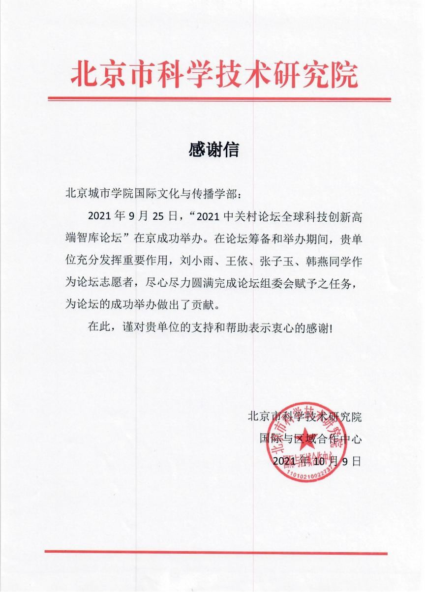 9月25日,“2021中關(guān)村論壇全球科技創(chuàng)新高端智庫(kù)論壇”在北京舉行,我校國(guó)際文化與傳播學(xué)部傳播學(xué)、廣播電視編導(dǎo)專業(yè)劉小雨等四位同學(xué)參與了論壇新媒體策劃宣傳工作,近距離參與了中關(guān)村論壇前期籌備。同學(xué)們在實(shí)踐中鍛煉了中英文海報(bào)設(shè)計(jì)、中英文視頻剪輯制作等綜合應(yīng)用能力,提高了工作責(zé)任感與職業(yè)擔(dān)當(dāng)。近日,北京市科學(xué)技術(shù)研究院國(guó)際與區(qū)域合作中心特向國(guó)際文化與傳播學(xué)部發(fā)來(lái)感謝信,對(duì)文傳學(xué)部同學(xué)們的實(shí)習(xí)表現(xiàn)給予了充分肯定。