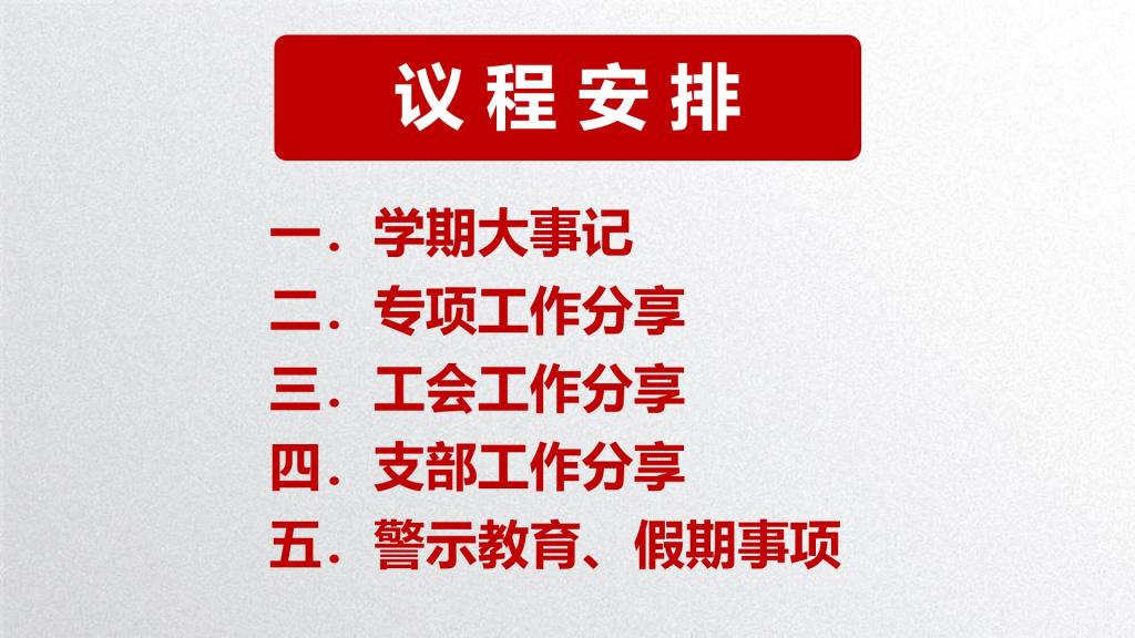 本次大會分為五個篇章:學期大事記、專項工作分享、工會工作分享、支部工作分享和警示教育及假期事項。