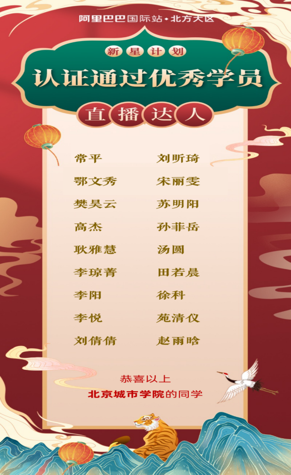 1月份新媒體達人創造營正式開班,阿里巴巴國際站北方大區商家運營專家何培沛老師參與培訓課程教學,多名業內知名講師線上直播方式分享跨境電商運營及直播相關知識。同學們通過為期兩周的線上培訓,于1月24日參加了阿里國際站“達人大賽”培訓考核,我學部共計18名同學通過認證,并于2月份進入商家實戰環節。