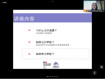 4月18日,我校國際文化與傳播學部法語專業與法國駐華使館高等教育署合作舉辦了《法國留學選擇及留法海歸分享會》的線上講座,為我校法語專業同學提供更多的留學信息和經驗分享。法語教研室主任歐陽慕弈、相關專業教師及法語專業80余名學生參加了此次講座。