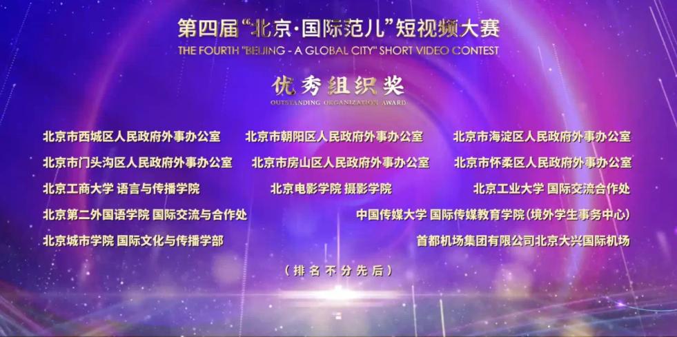12月23日,第四屆“北京?國際范兒”短視頻大賽頒獎儀式在中國電影博物館圓滿落幕。我校龔裕書記出席頒獎儀式并擔任頒獎嘉賓。在此次大賽中,我校多部學生作品脫穎而出獲得一等獎等獎項,國際文化與傳播學部獲得最佳組織獎,廣播電視編導專業碩士生導師徐錦老師獲得優秀指導獎。