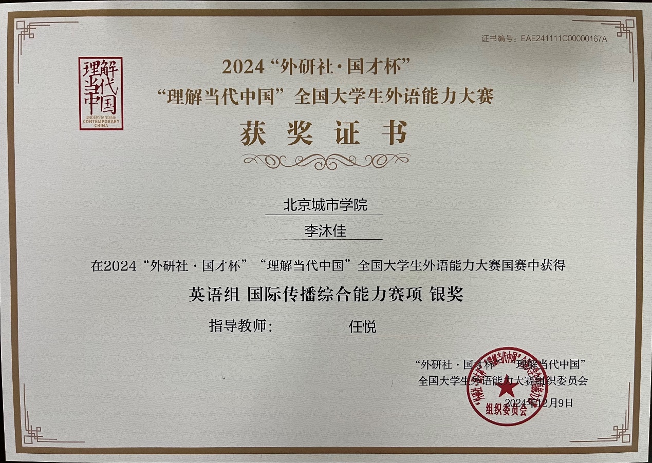 近日,2024外研社·國才杯“理解當代中國”全國大學生外語能力大賽總決賽在北京落幕,大賽以“理解中國、溝通世界”為主題,吸引了全國來自1300多所院校的近70萬學生參加。國際文化與傳播學部2024級傳播學專業學生李沐佳成功晉級全國總決賽,與北京外國語大學等4000余名國賽選手同臺競技,通過筆試、演講等層層環節選拔,最終在國際傳播綜合能力賽項中斬獲銀獎。