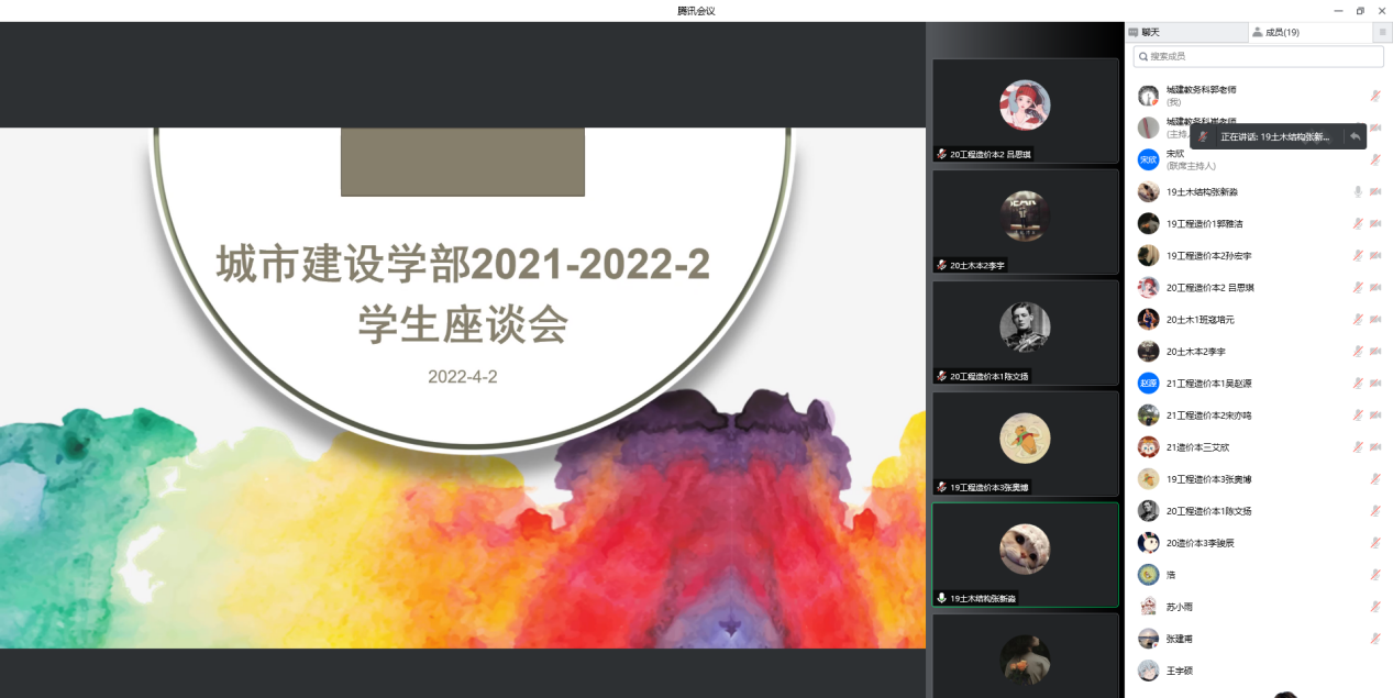 4月2日,城市建設(shè)學(xué)部在線上召開了2021-2022學(xué)年春季學(xué)期學(xué)生代表座談會(huì)。來自學(xué)部各個(gè)班級(jí)的39位學(xué)生代表參加了本次會(huì)議,出席會(huì)議的還有城市建設(shè)學(xué)部副主任張建甫、學(xué)工辦主任陳浩、各教研室秘書、教務(wù)科全體教師。會(huì)議由教務(wù)科科長(zhǎng)宋欣主持。