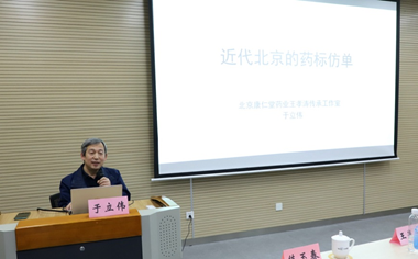 主題講座環節,北京康仁堂藥業王孝濤傳承工作室負責人于立偉經理以《近代北京的藥標仿單》為主題,從劉海戲金蟾的故事、已被列為北京市非遺名錄的天壇益母草故事探討了北京益母草膏申遺的思路,通過近代北京藥標仿單的對比分析展示了北京中醫用藥的特色,為梳理和申報北京地區非遺項目帶來了更多視角和思路參考。