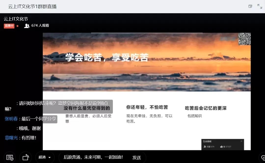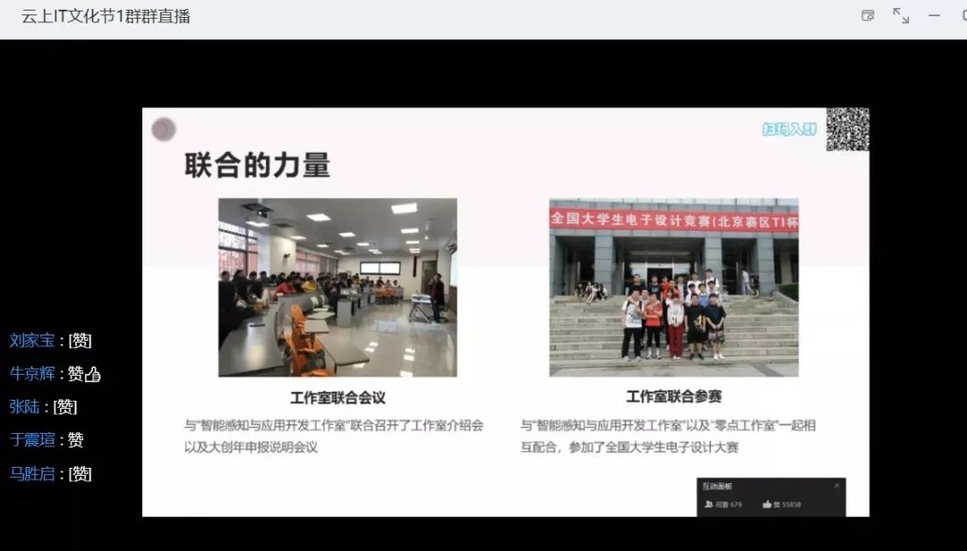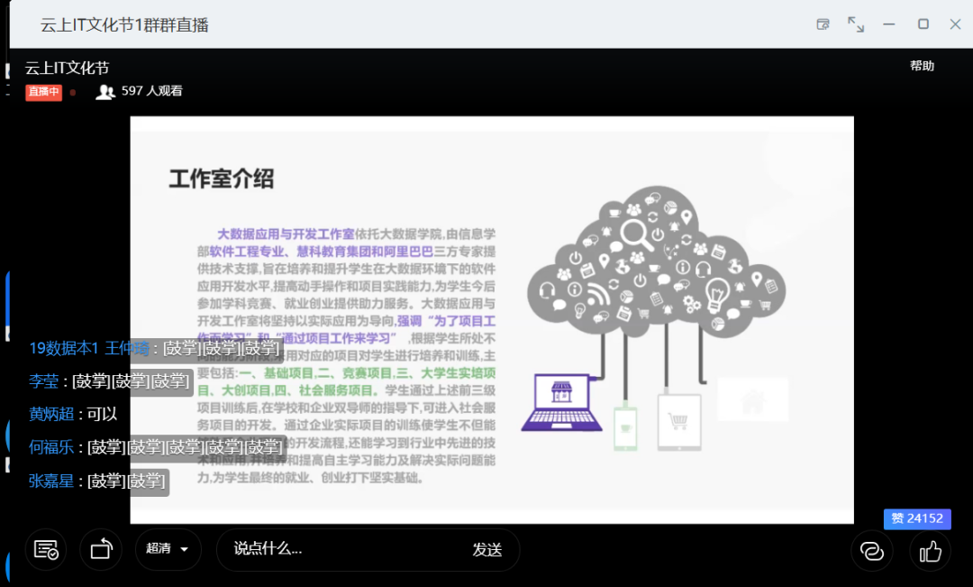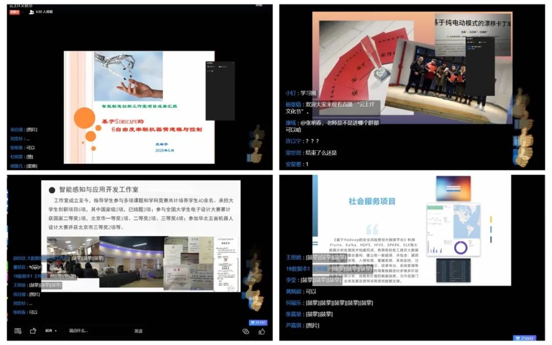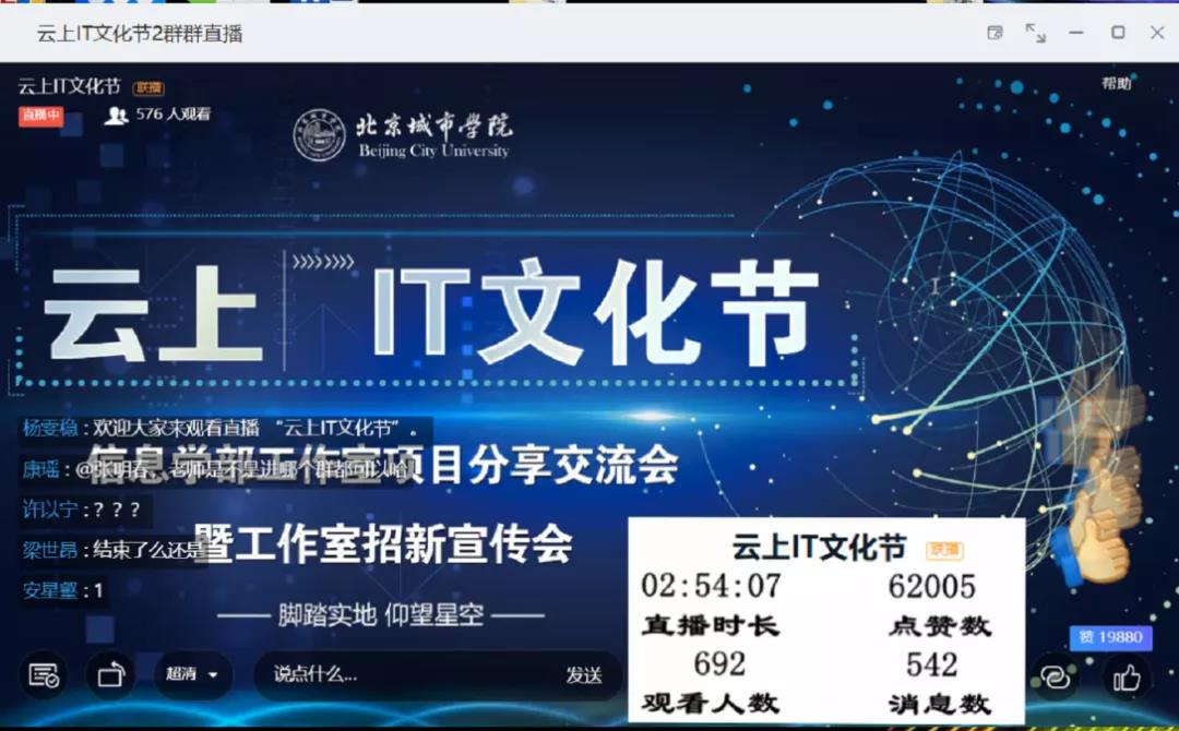 6月10日,信息學部第六屆IT文化節工作室項目分享會暨工作室招新宣傳會在“云上”舉行。特殊時期,活動首次采用線上直播的方式,信息學部主任王輝、黨支部書記趙佳因、學部全體老師、工作室學生負責人、600多名大一、大二的學生參加本了次活動。本次活動持續3個小時,活動期間線上討論超500人、點贊超6萬次,是歷年文化節規模最大、互動最熱烈的一次。