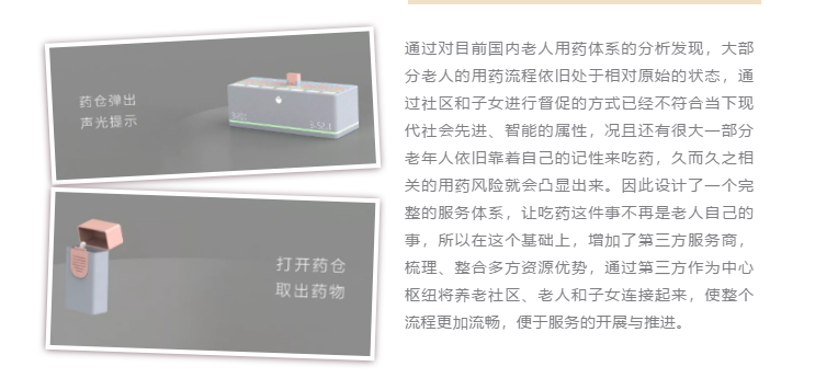 該服務設計作品通過觀察到的高血壓老年人于居家環境中存在的各類用藥問題作為解決的主要目標,整合了養老社區與第三方的服務優勢和資源優勢,將老人、養老社區、第三方作為主體進行聯結,相比于以往老人自己把控吃藥環節而言,加強了外部把控。而智能藥盒作為直接面對老人的用藥智能產品,也采用定制化的配藥體系,合理解決了老人在用藥過程中存在的諸多不便。配套的APP系統也將保障三方體系內信息的互通,并提高第三方與養老社區的服務質量與效率。讓老年患者們安全、合理、放心地吃藥,不再因為吃藥問題而苦惱,也讓他們感受到社會對于他們是關心的、包容的。