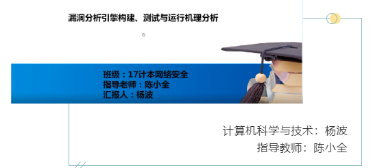 該方案在指導教師與中科院部分博士的幫助和指導下由楊波同學獨立完成。在方案實施的過程中,楊波同學查閱和研讀了大量的國外相關的學術論文,設計了實驗方案、驗證方案和實驗環境。在大量的實驗和分析基礎上,撰寫了30份漏洞分析引擎研究報告,作為項目的研究成果提交給用戶,受到了用戶的重視,充分體現了楊波同學從事科學研究的專業性。