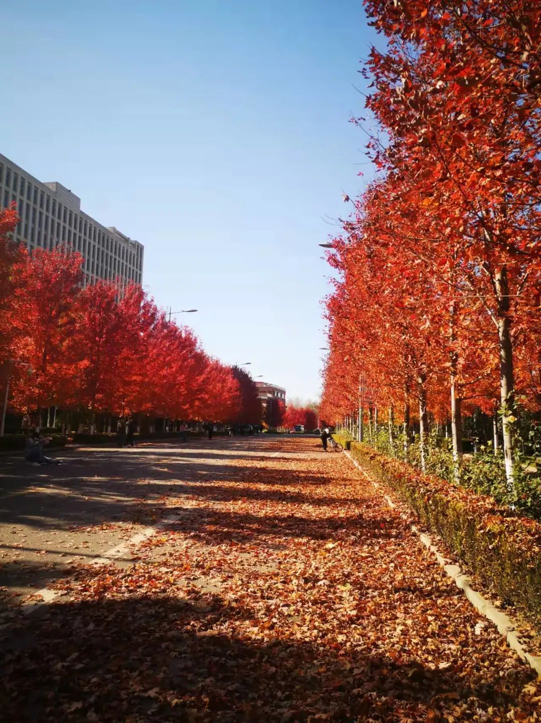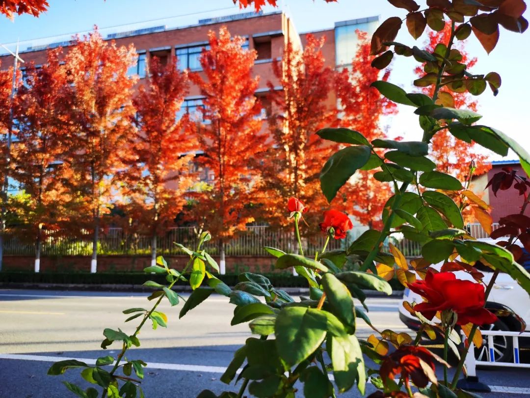 校園秋印跡--李丹丹--綠樹、紅葉、粉樓為校園裝點上秋的印跡,顯得愈發(fā)光彩宜人