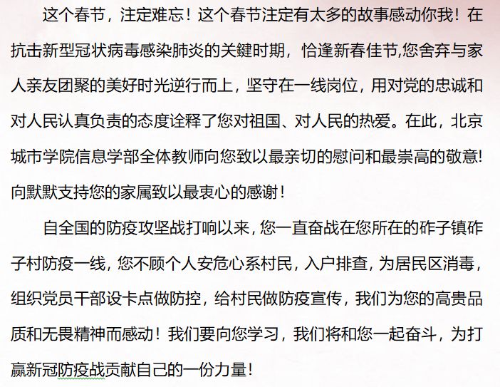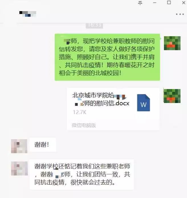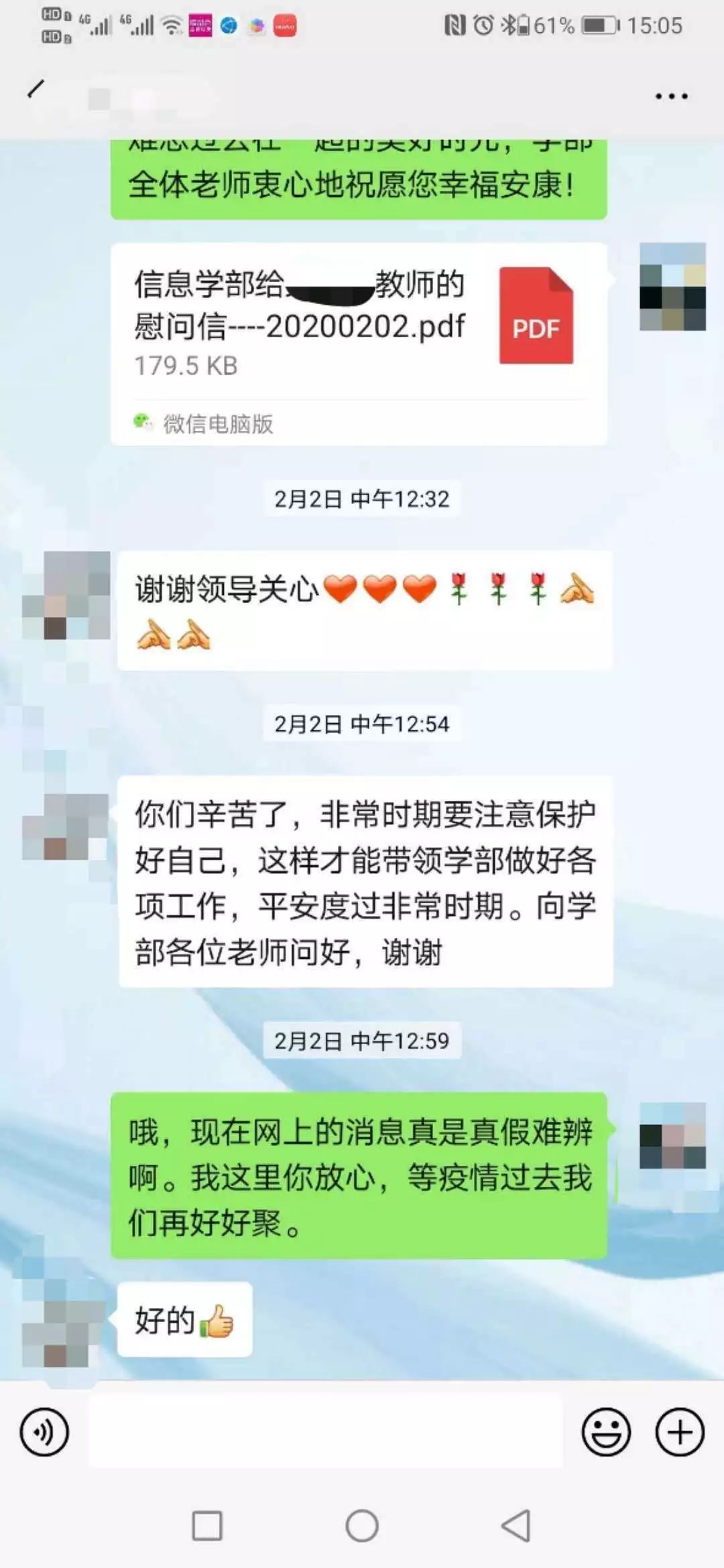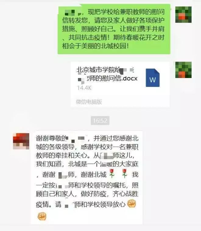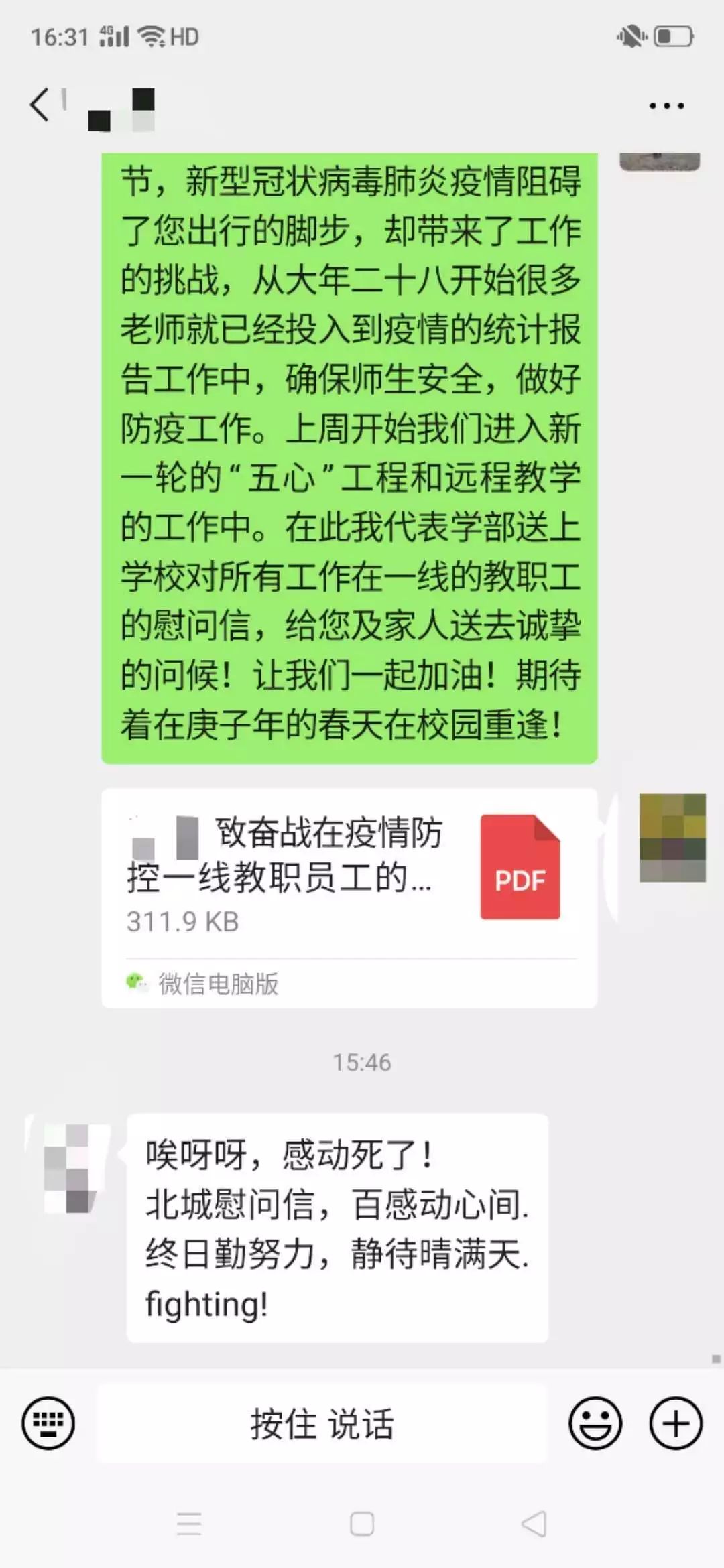 奮斗在教學(xué)一線的兼職教師,像我們的家人一樣并肩作戰(zhàn),是學(xué)部發(fā)展不可或缺的力量。他們的平安健康牽動(dòng)著全體師生的心。疫情發(fā)生后,支部第一時(shí)間委托專業(yè)溝通對(duì)兼職教師轉(zhuǎn)達(dá)支部慰問(wèn)信。